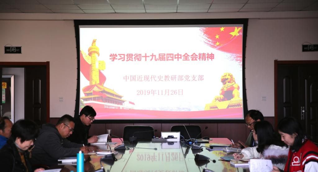 11月26日,根据上级党组织安排,中国近现代史教研部党支部在J9-223会议室召开专题会议,认真学习党的十九届四中全会精神。会议由支部书记宋开金主持,副院长邵勇与支部全体党员参加。