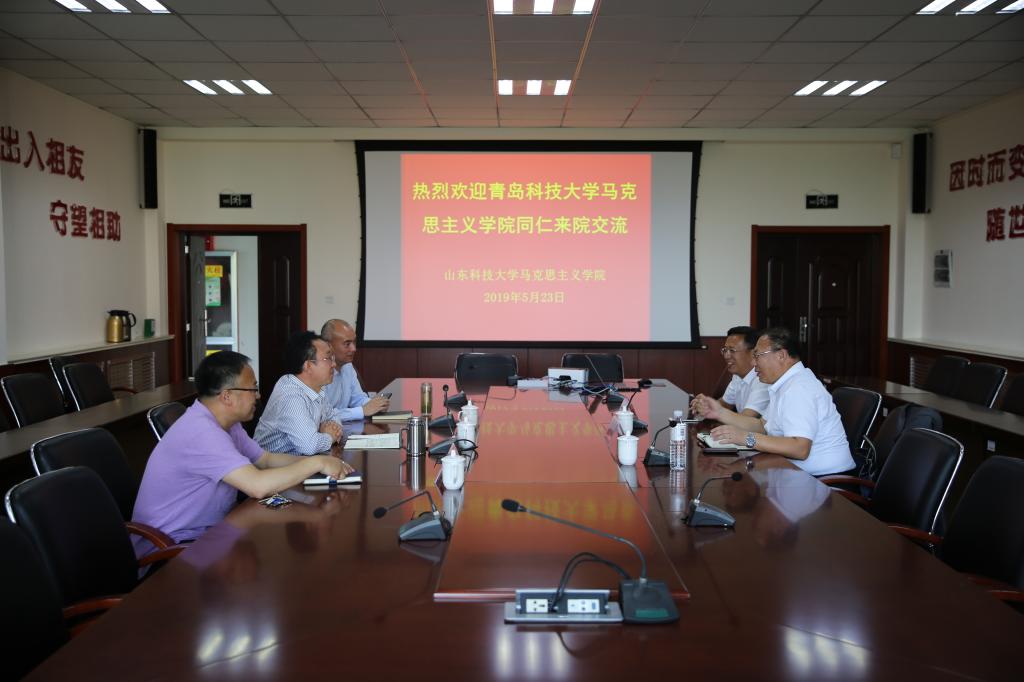 5月23日,青岛科技大学beat365唯一官网院长曹胜、山东省高校马克思主义理论专业委员会副主任委员牟宗荣来院交流,院长逄奉辉、院党委书记郭加书、副院长邵勇与客人进行了座谈。