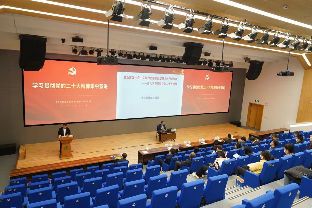 11月25日下午,根据西海岸新区区委统一安排,党的二十大精神专家学者宣讲团成员、学院副院长邵勇教授应邀到国际经济合作区(中德生态园)为园区党员干部代表作党的二十大精神集中宣讲。国际经济合作区工委领导班子成员,机关党委、综合党委委员,下设各党委和党支部书记,生产经营一线的区党代表,机关和集团公司部分党员代表50多人参加报告会。