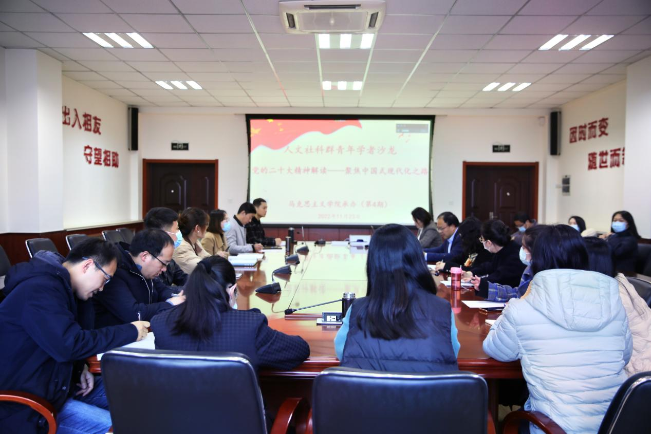 为深入学习贯彻党的二十大精神,深刻理解习近平新时代中国特色社会主义思想的丰富内涵、精神实质和实践要求。11月23日下午,由学校人文社会科学学科群主办,beat365唯一官网承办的学术沙龙活动在J9-227采用专家讲座和圆桌会议、线下线上相结合方式成功举办。活动由副院长邵勇主持,人文社科群各学院部分青年教师参加,beat365唯一官网硕士研究生线上旁听学习。本次活动的主题为“党的二十大精神解读——聚焦中国式现代化之路”,特别邀请学院副院长常春教授宣讲党的二十大精神,文法学院国虹副教授、学院贾强副教授、周月学术副教授、张建飞老师分别做主题发言。常春教授开篇点题,主要围绕中国式现代化的五个重要特征、本质要求、五项重大原则等展开论述,并结合二十大报告和当前学界对于这一问题的研究现状做了梳理,进而指出中国式现代化是当前学界热议、具有重大意义的热点问题。随后,国虹副教授讲述了现代化理论的缘起,并从线性发展历史角度分享了对于现代化的研究方法。贾强副教授则从恩格斯自然观视角切入、阐述了习近平生态文明思想所渗透的的辩证法思想。周月老师结合对全过程人民民主的研究,指出现代化所具备的三点元素,即成熟稳定制度、共同的价值理念、代表人类文明发展趋势。张健飞老师围绕“大历史观”视野指出,身处“两个大局”相互交织的关键时期,要顺应历史潮流,把握历史大势,增强历史主动。现场参会人员认真聆听、仔细记录。大家纷纷表示,沙龙准备充实、主题鲜明,紧扣时政热点,为学深悟透党的二十大精神搭建良好平台,一定要将焕发的思想自觉转化为科研教学源动力。