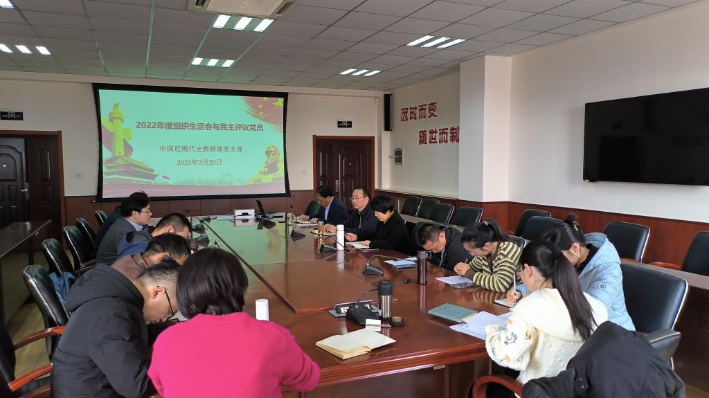 3月20日上午,中国近现代史教研部党支部在J9-223会议室召开2022年度组织生活会,并开展民主评议党员工作。会议由支部书记宋开金主持,全体党员参加。院党委书记徐波出席会议。